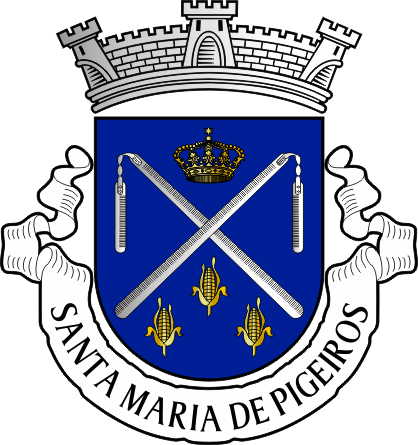 Escudo de azul, dois moais de prata passados em aspa, acompanhados em chefe de uma coroa mariana de ouro e em contra-chefe de três espigas de milho em roquete folhadas de ouro. Coroa mural de três torres de prata. Listel branco com a legenda a negro, em maiúsculas: “SANTA MARIA DE PIGEIROS“.